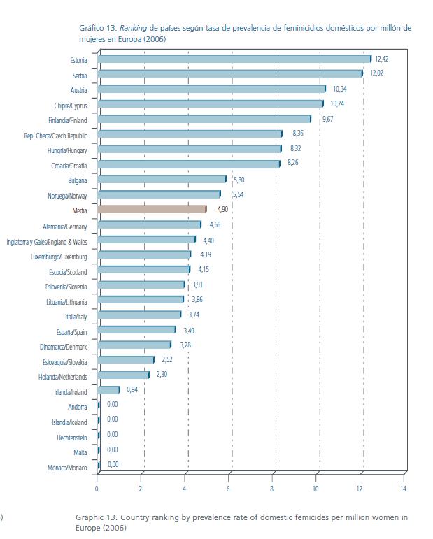 La reciente publicación de una estadística del Centro Reina Sofía para el Estudio de la Violencia sobre el índice de feminicidios en 40 países, también respalda esta teoría. Si bien, ante una explicación “pro-machista” del fenómeno cabría esperar que en países de tradición más liberal hubiera un índice menor de asesinatos de mujeres que en países de costumbres más patriarcales, la realidad es diferente: países del norte de Europa, como Finlandia, que lleva aplicando desde 1987 una de las políticas de igualdad más ambiciosas de la Unión Europea, presenta un índice de feminicidios que casi duplica al de España, país que junto con Italia se encuentra entre los últimos de esta trágica lista, muy por debajo de Alemania, Bélgica, Austria o Dinamarca.